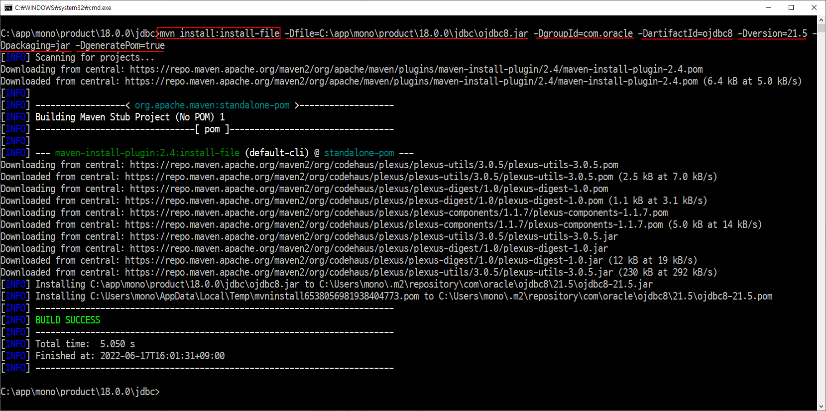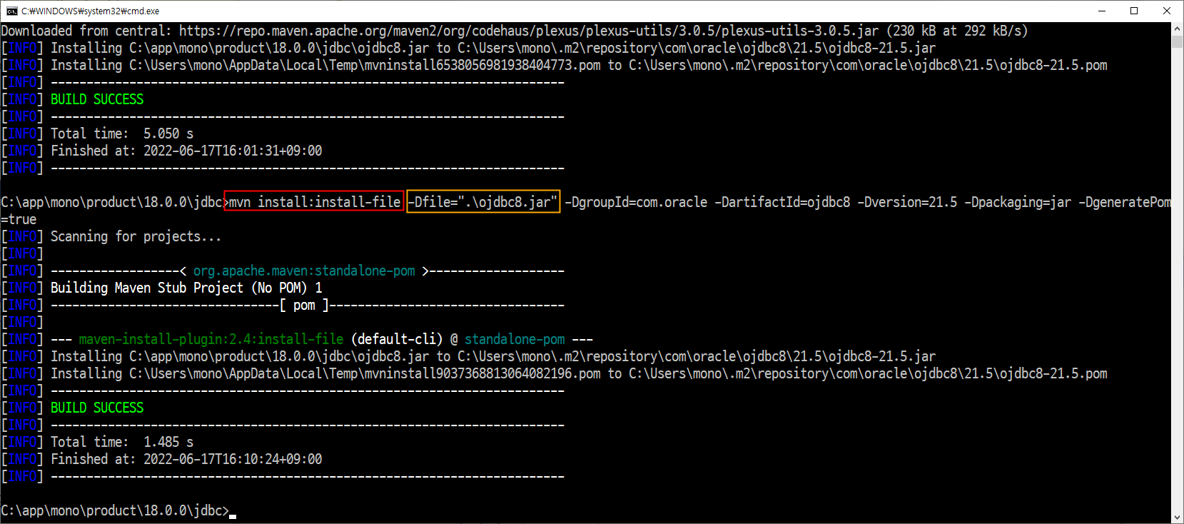 mvn install:install-file -Dfile=C:\app\mono\product\18.0.0\jdbc\ojdbc8.jar -DgroupId=com.oracle -DartifactId=ojdbc8 -Dversion=21.5 -Dpackaging=jar -DgeneratePom=true