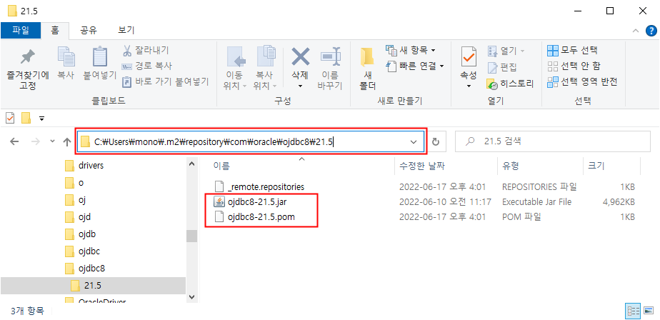 참조할 파일명은 추가한 이름에 따라 변경되어 저장됩니다. ojdbc8.jar 파일이 ojdbc8-21.5.jar로 변경되었습니다.