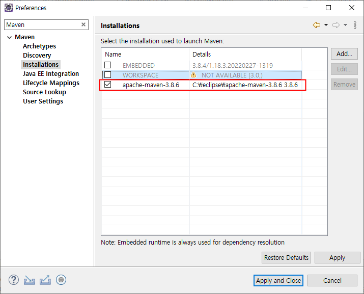 이렇게 등록해서 Maven을 자신이 설치한 Maven 실행 파일로 변경할 수 있습니다만 저는 변경하지 않았습니다.