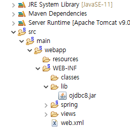 이런 설정인 경우 tomcat 실행 시 jar파일을 찾지 못하게 되므로 WEB-INF/lib 폴더에 ojdbc8.jar를 추가해주어야만 실행이 됩니다.