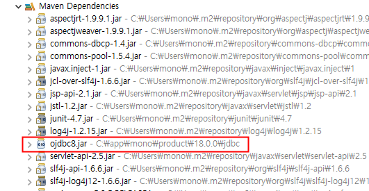 Maven Depedencis에서 확인해보면 파일의 위치가 다른 Maven 경로는 Repository를 참조하고 있지만 ojdbc8.jar 만 다른 곳을 참조하고 있는 것을 확인할 수 있습니다.