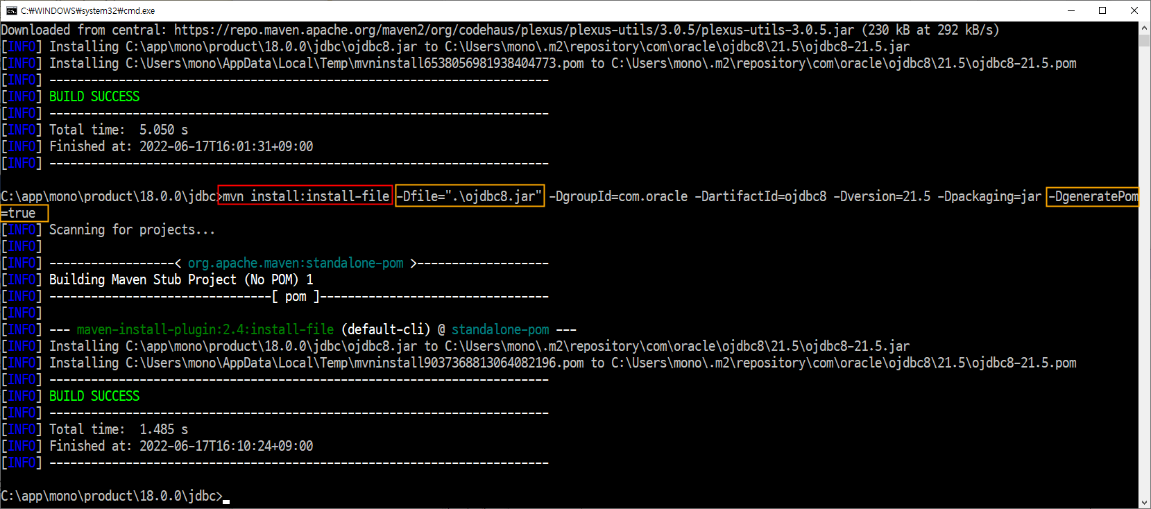 mvn install:install-file -Dfile=C:\app\mono\product\18.0.0\jdbc\ojdbc8.jar -DgroupId=com.oracle -DartifactId=ojdbc8 -Dversion=21.5 -Dpackaging=jar -DgeneratePom=true