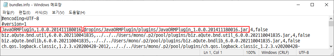 이클립스 configuration/org.eclipse.equinox.simpleconfigurator/bundles.info 파일도 수정이 되어 있었습니다.