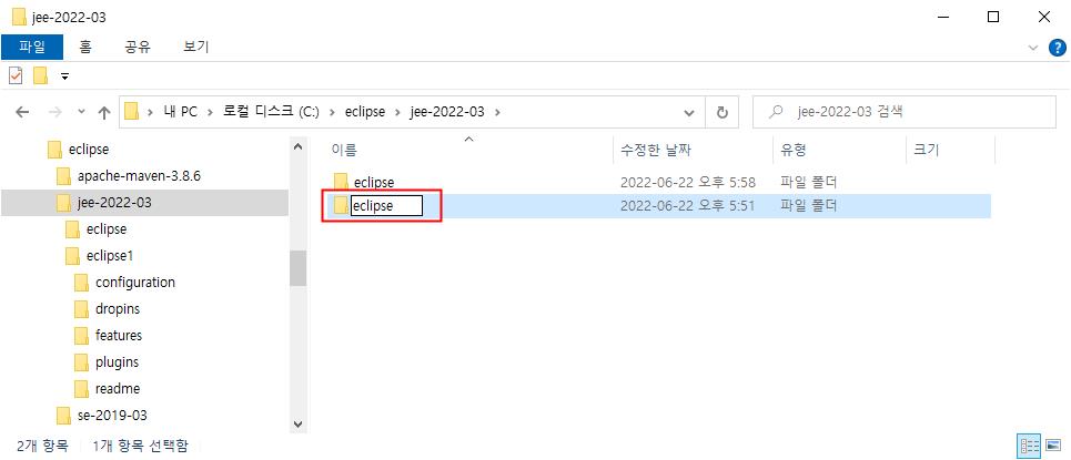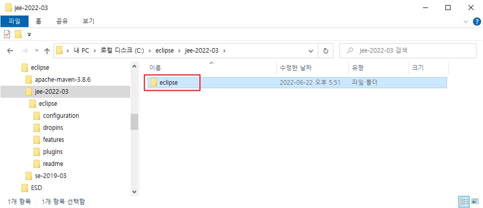 실행을 하고 나면, 기존에 이름을 변경한 eclipse1 폴더 외에 eclipse 폴더가 만들어집니다.
