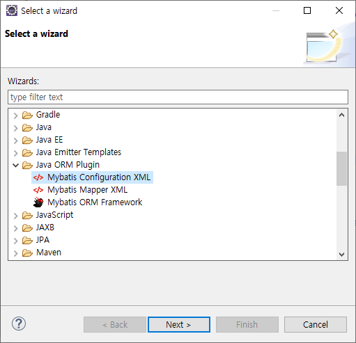 New > other - Java ORM Plugin에서 Mybatis Configuration XML을 선택합니다.