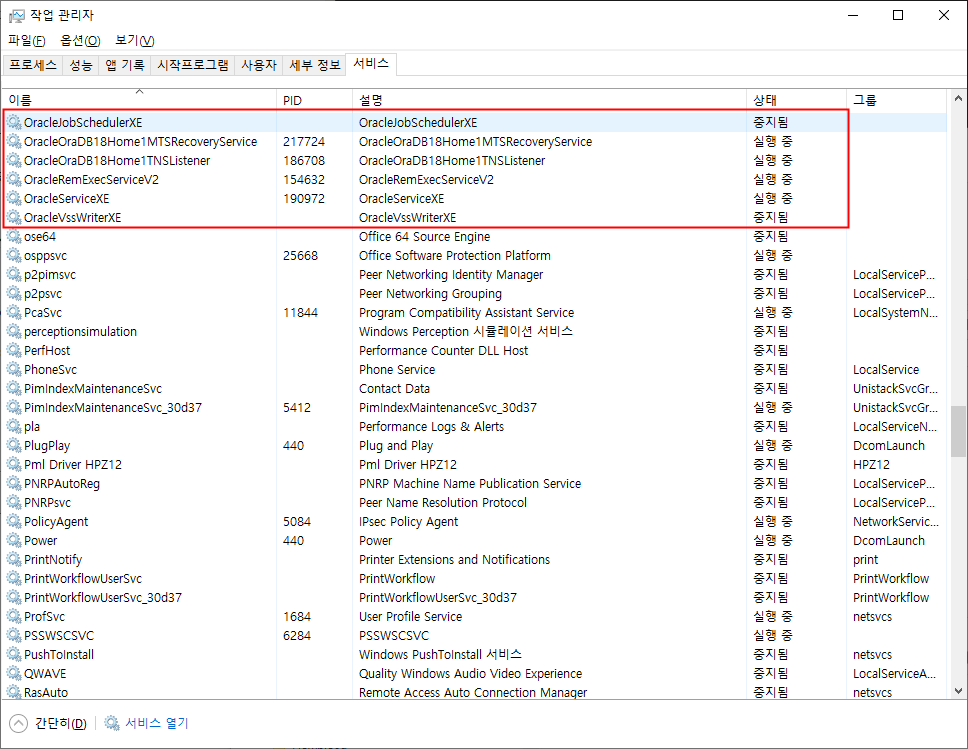 작업 관리자를 열어 Oracle 관련 서비스가 등록되었는지 확인합니다.