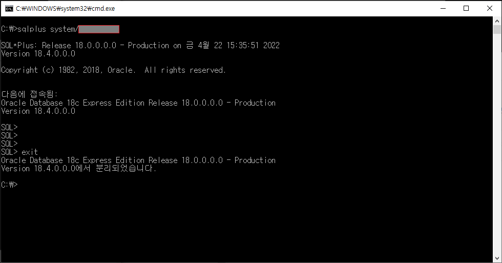 windows의 cmd창을 열어 sqlplus로 접속이 되는지 확인해봅니다.