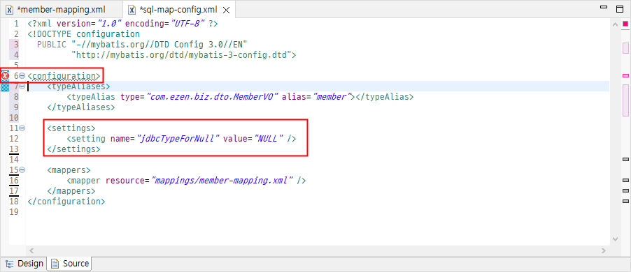 한 가지 주의할 점은 <settings> 섹션은 반드시 <typeAliases> 위에 입력해야 합니다.