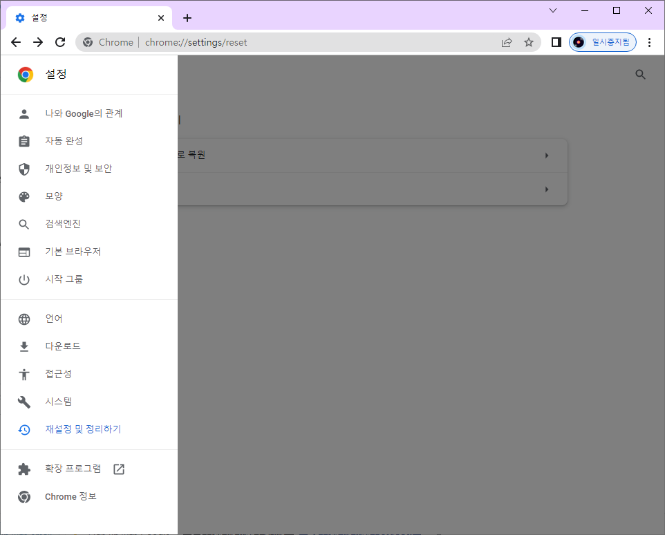 크롬의 메뉴에서 설정 > 재설정 및 정리하기로 들어가거나,