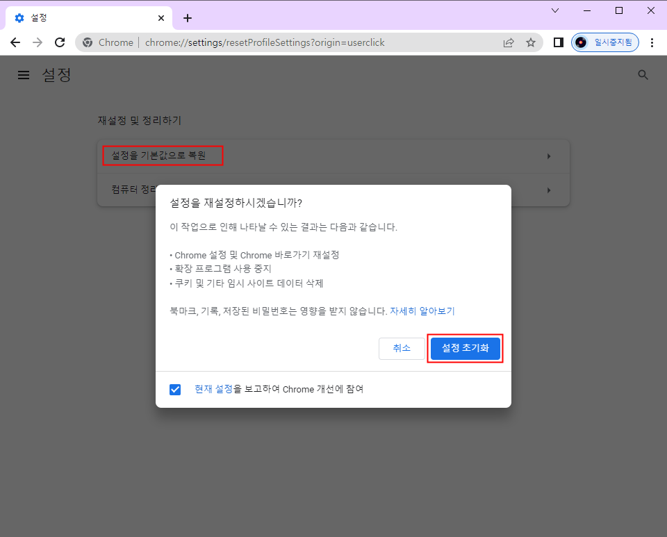 '설정을 기본값으로 복원'을 클릭하고 '설정 초기화' 버튼을 눌러 초기화합니다.