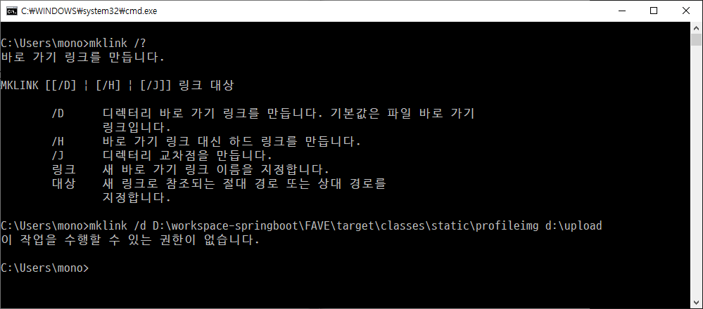 여기서는 심볼릭 링크를 만들 기 때문에 /d 옵션을 사용합니다.