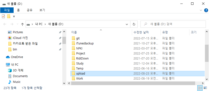 d:\upload에 profile 이미지를 업로드했고, 이를 참조하기 위해서 static 폴더에 심볼릭 링크를 profileimg라는 이름으로 생성했습니다.