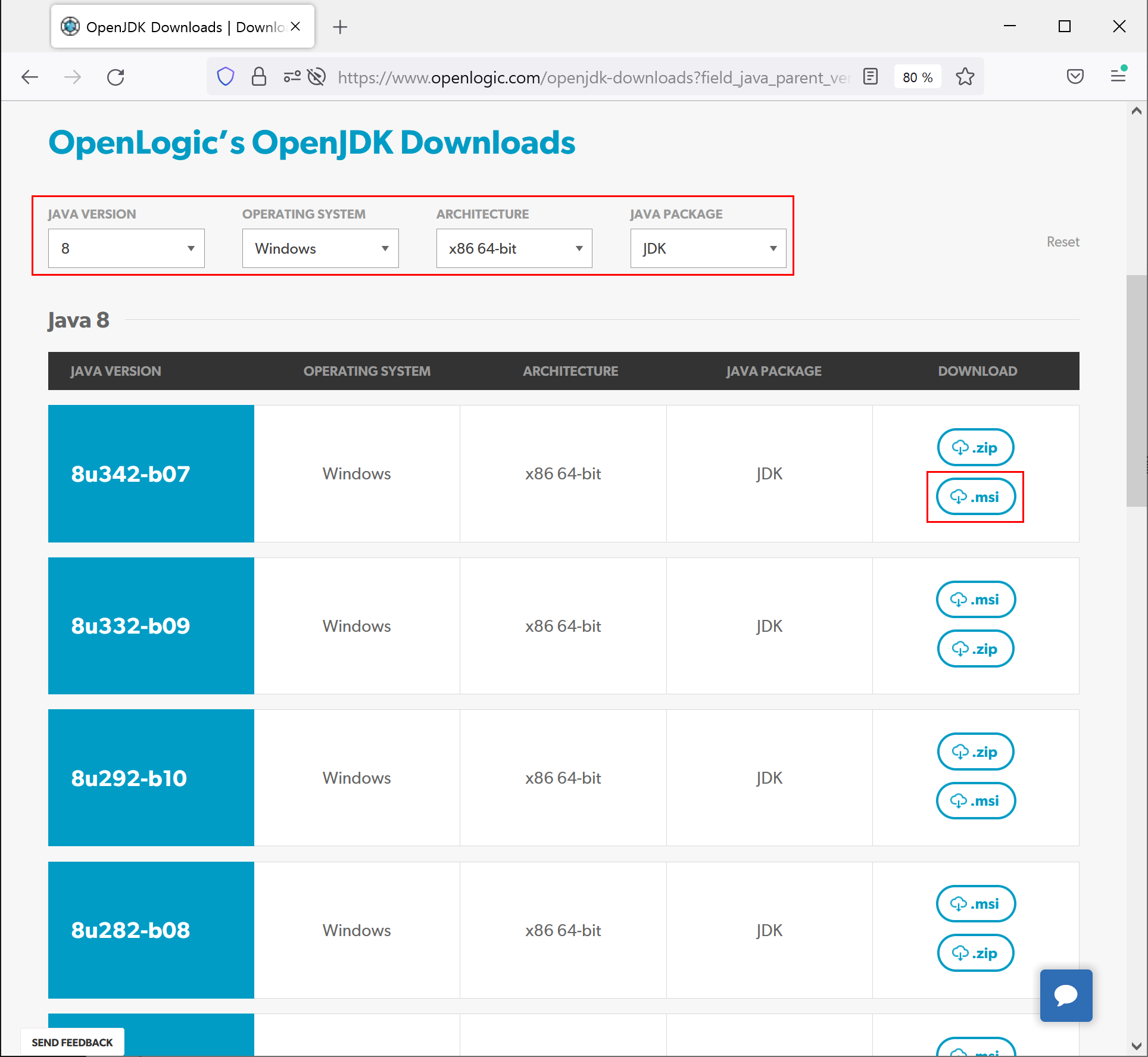 저는 현재 제 요구 환경에 맞게 Java8, Windows x86, 64bit, JDK를 선택했습니다.