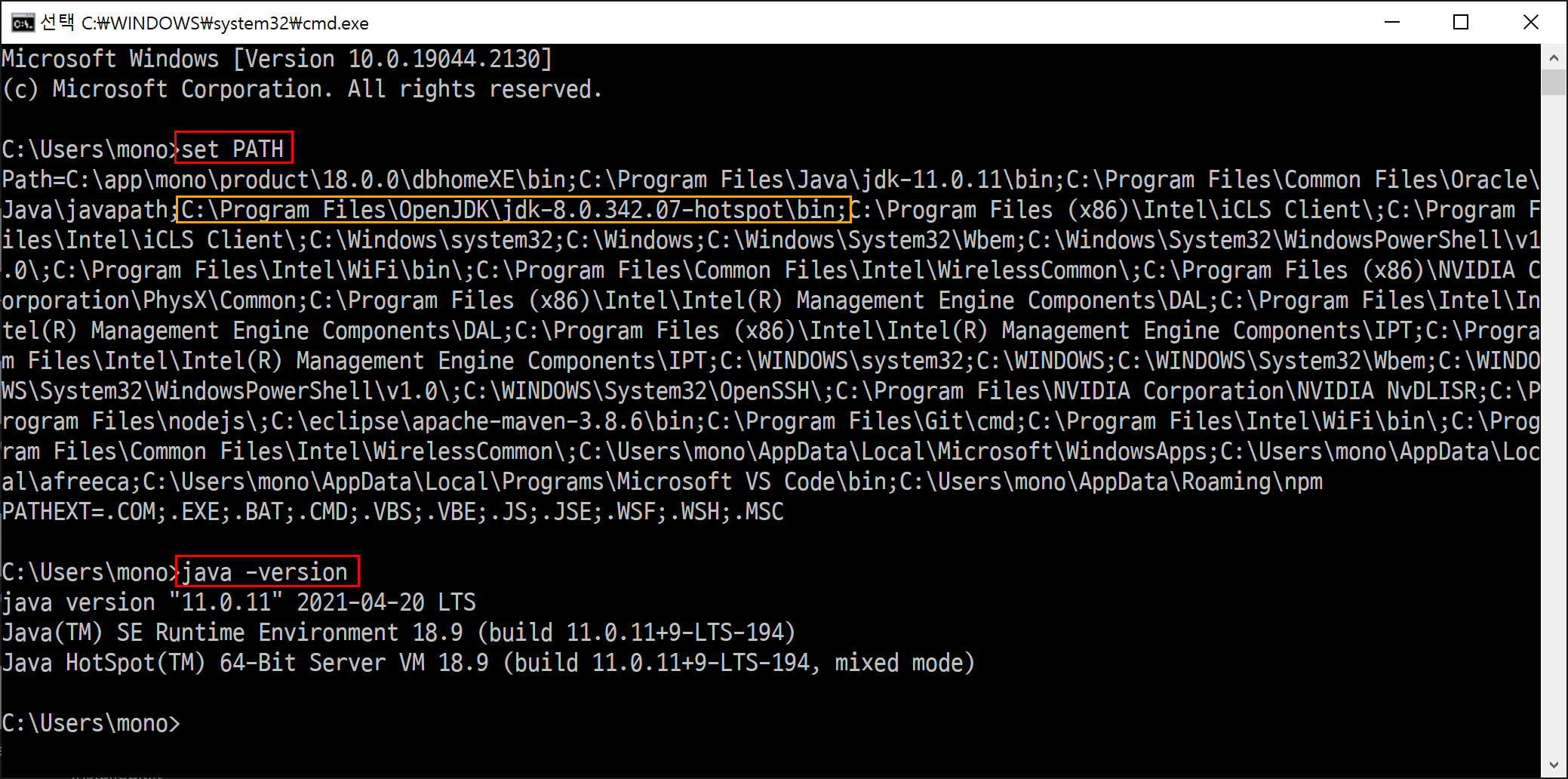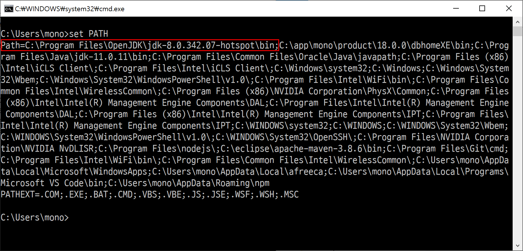cmd 창에서 'set PATH' 명령을 사용하여 확인할 수 있습니다.