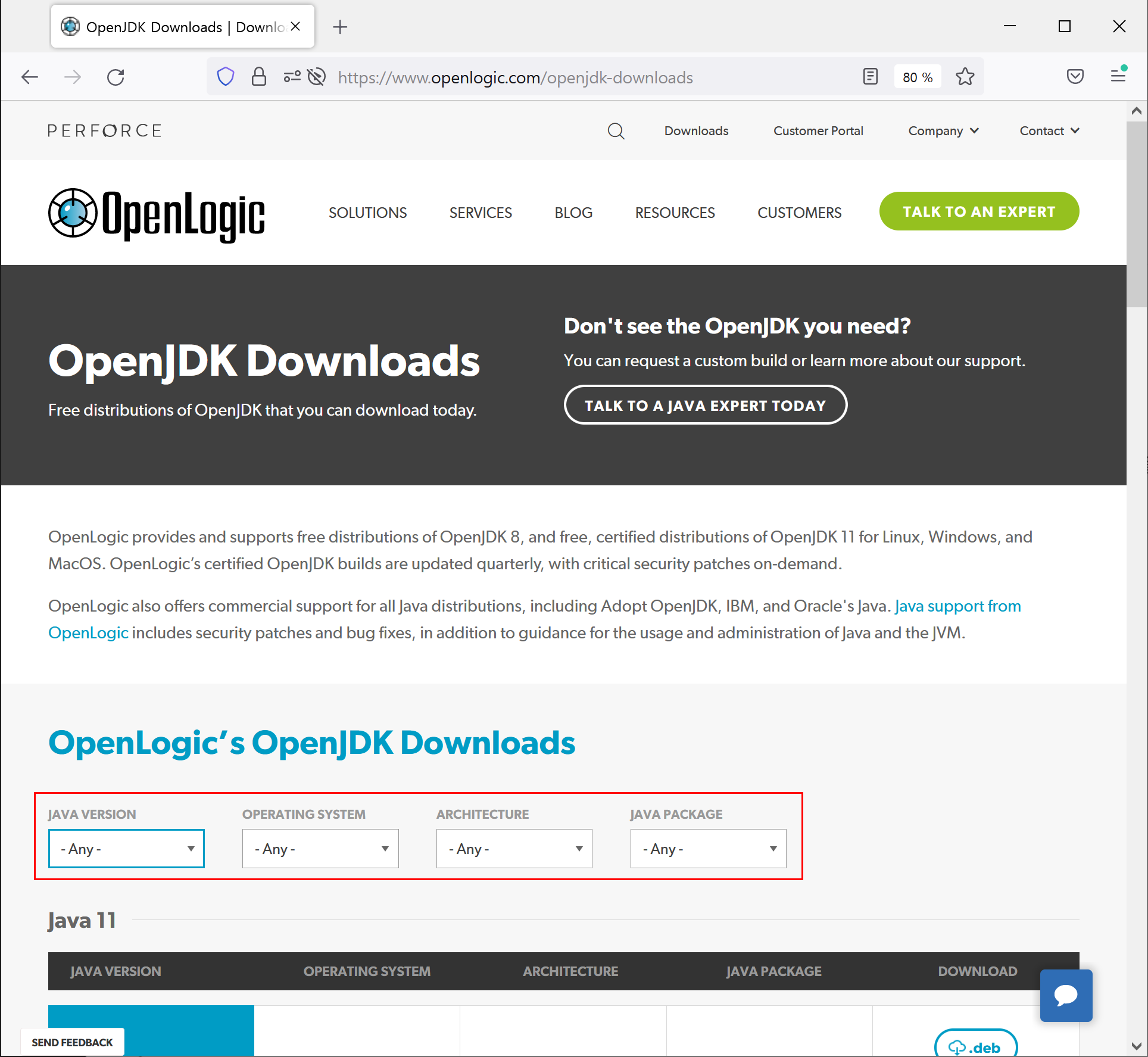 잠깐 살펴보니 Java는 8, 11 버전, OS는 Linux, MacOS, Windows를 지원하며 아키텍처는 아쉽지만 x86 32bit, x86 64bit 만 지원하는 것 같습니다. 패키지는 JDK, JRE를 고를 수 있습니다.