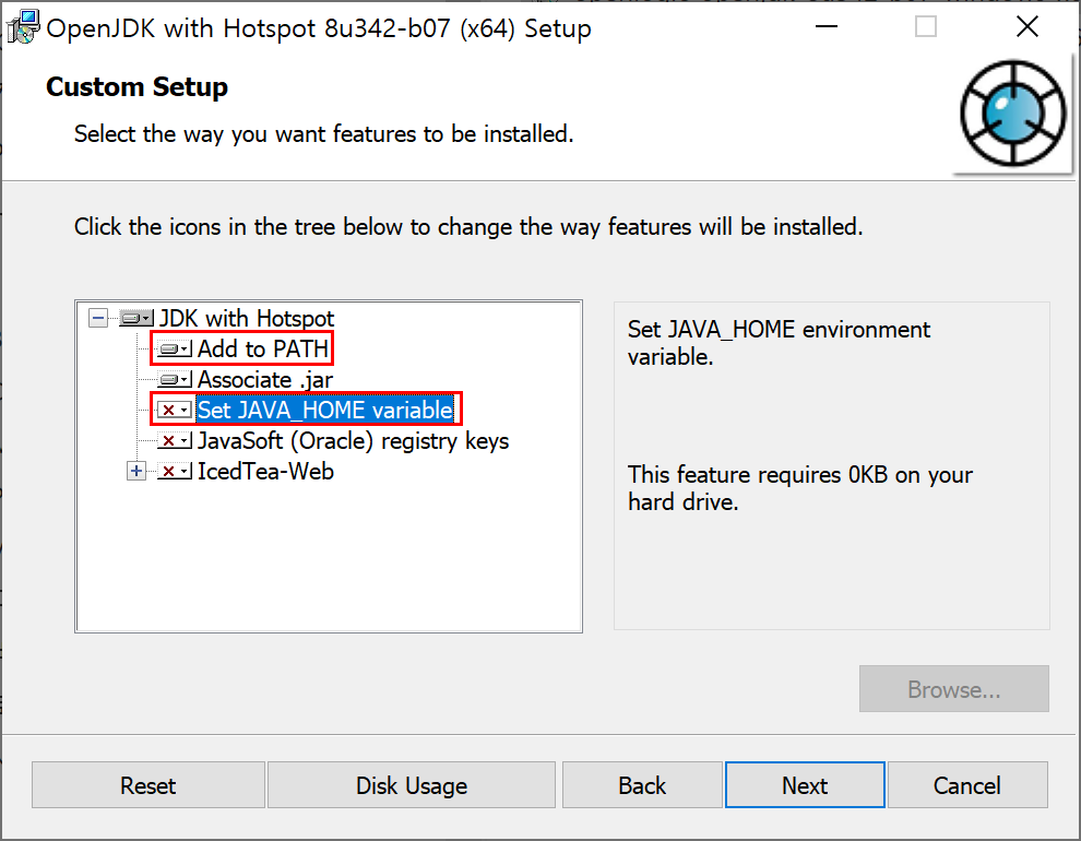몇 가지 옵션이 더 있습니다만 주의하면 좋은 것이 'Add to PATH'와 'SET JAVA_HOME variable'입니다.