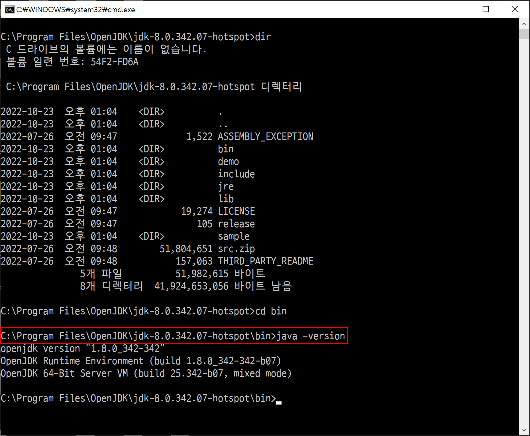 설치 옵션에서 'Add to Path'를 지정하지 않았다면 설치 경로의 bin 폴더에서 'java -version'을 실행하면 확인할 수 있습니다.