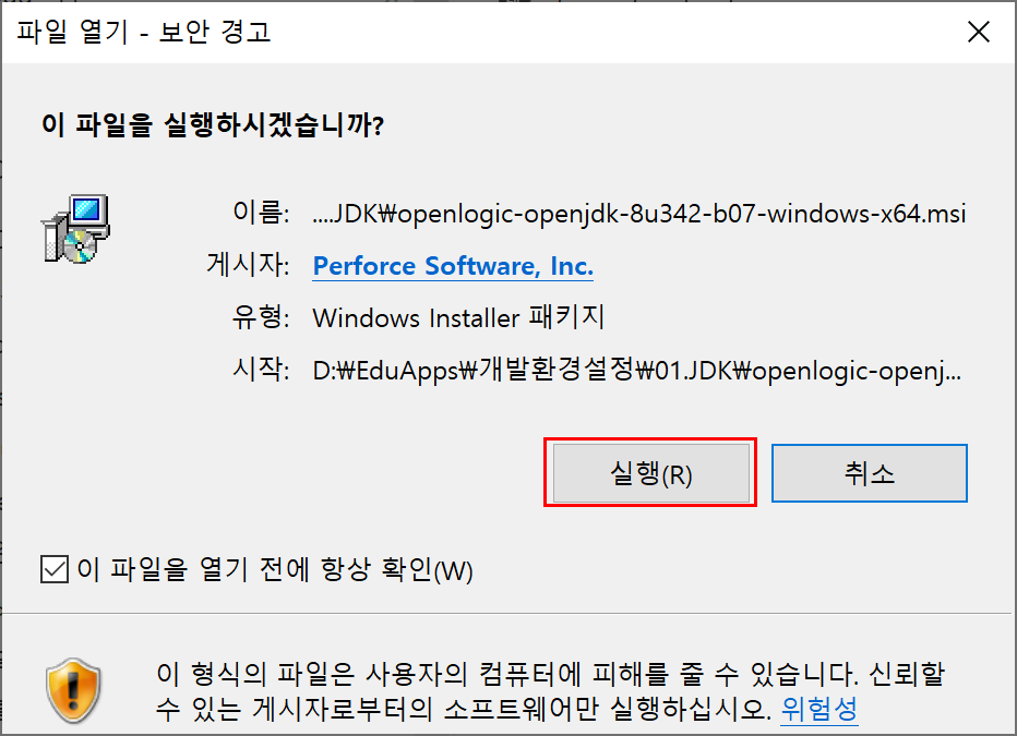 경우에 따라서는 파일 보안 안내가 나옵니다. 실행(R) 버튼을 클릭해 실행합니다.